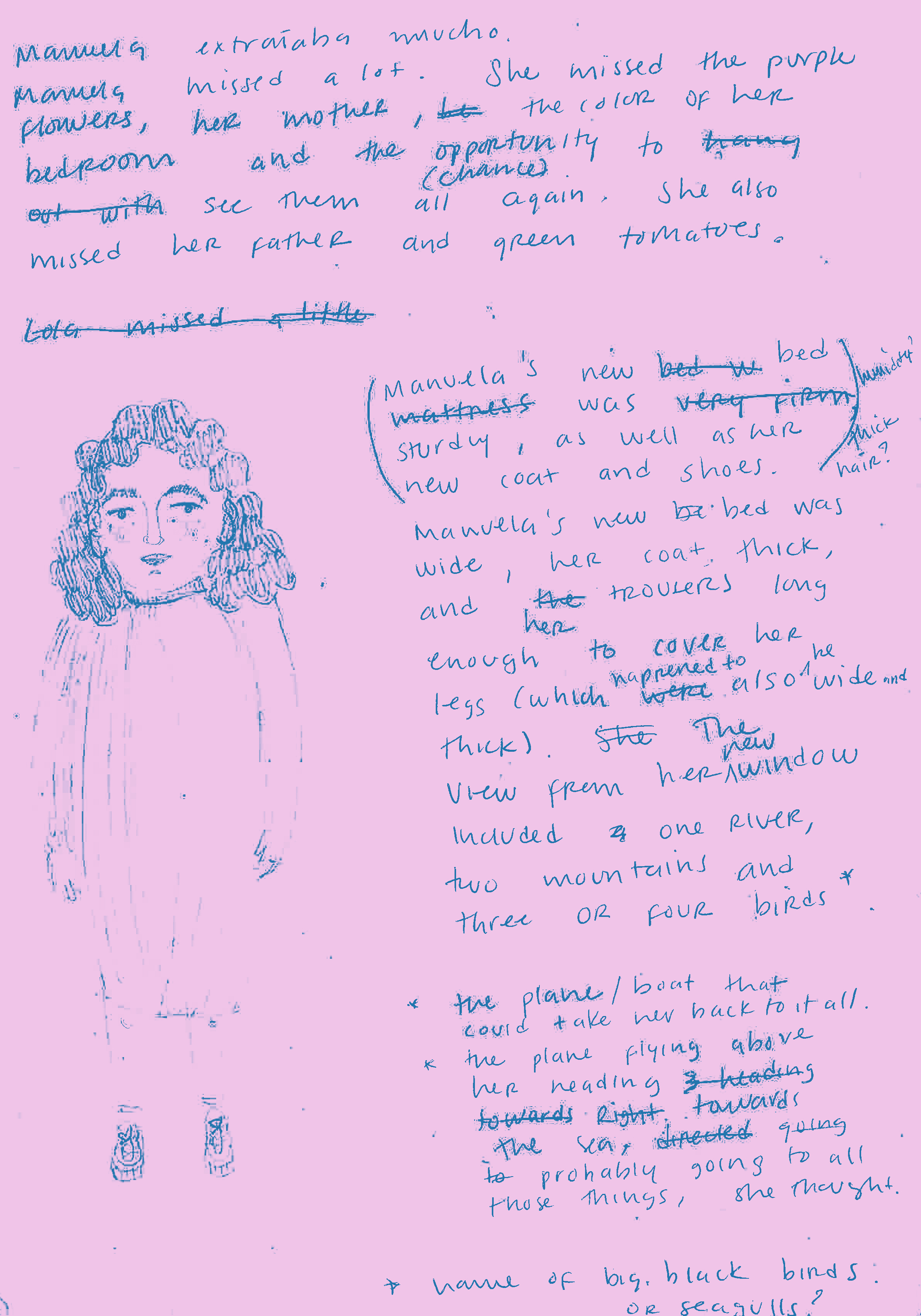 I struggled with the language because when i write in Spanish I use wordplay frequently, and it is difficult to translate that rhythm to English. For example, the word “miss” in Spanish is “extrañar”, which means both “to miss” and “to think something is odd”. I wanted to start by saying “Manuela extrañaba mucho” which translates to “Manuela missed a lot”. In Spanish that sentence would say that Manuela missed a lot of things and was also thought as strange.