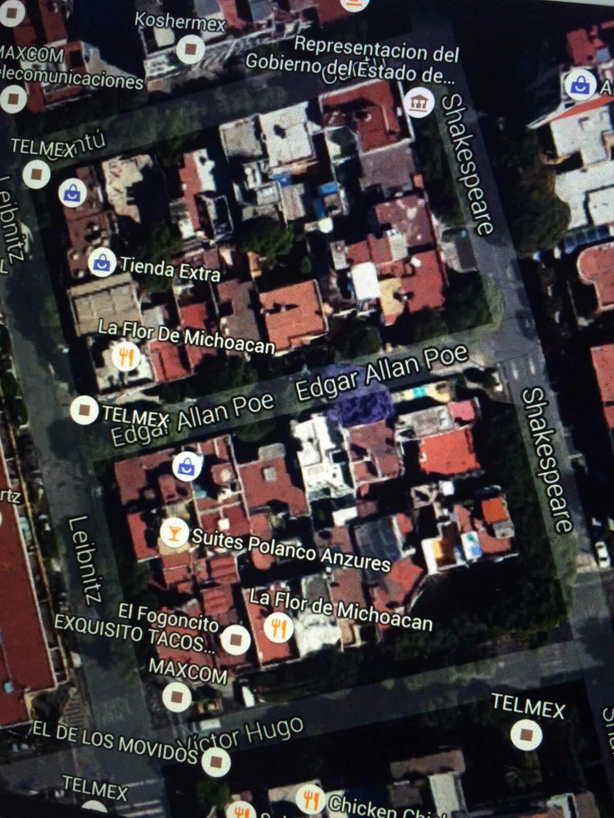 The image is a screenshot from the satellite view in Google Maps of my neighborhood. The purple shape is the top of that jacaranda tree in spring time.