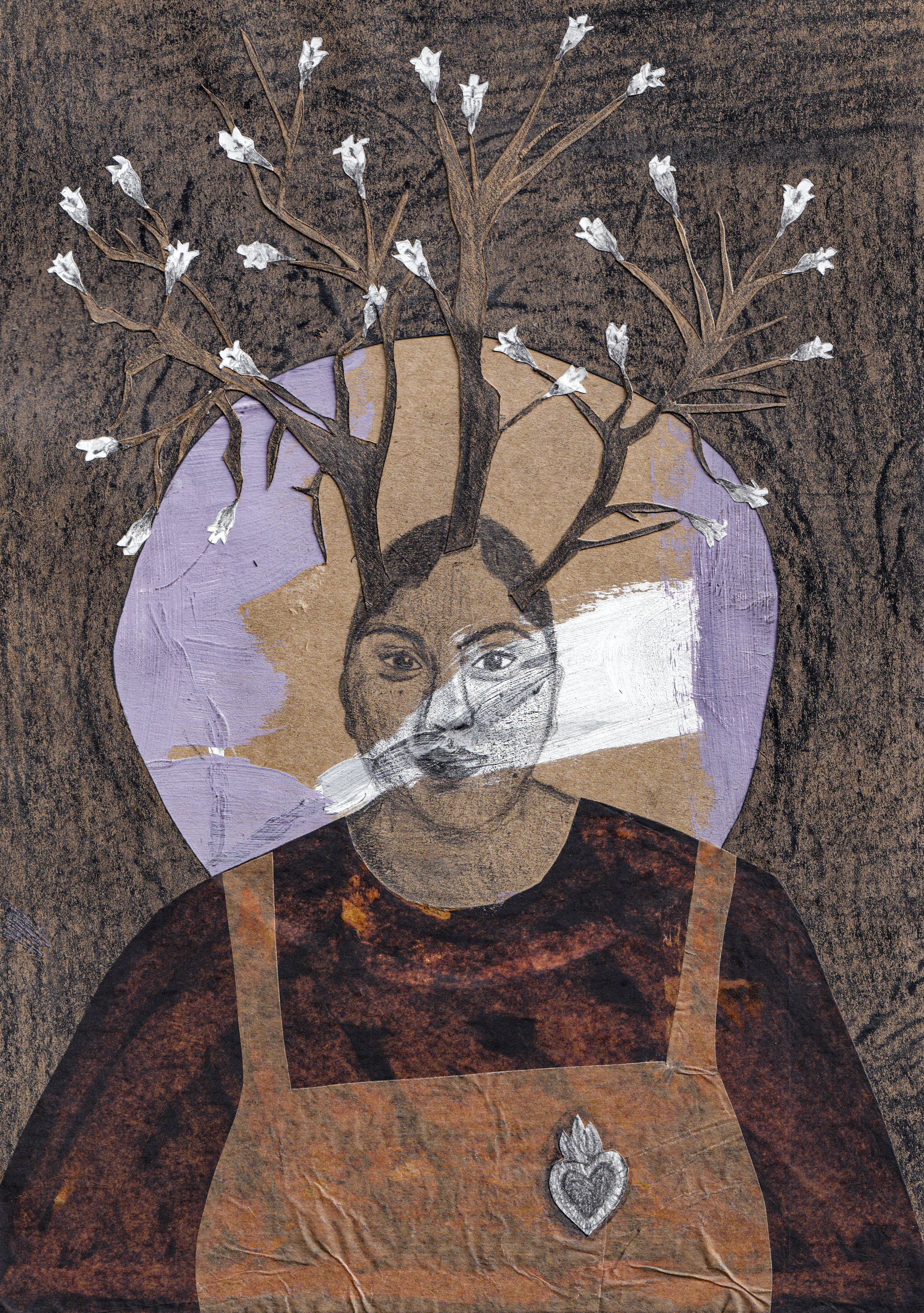 These are the references I used. The first is a photo I took of the jacaranda tree in front of my house, from my rooftop. The second is a portrait my husband took of me, and the third is part of a collection of tin hearts I’ve been carrying around with me.