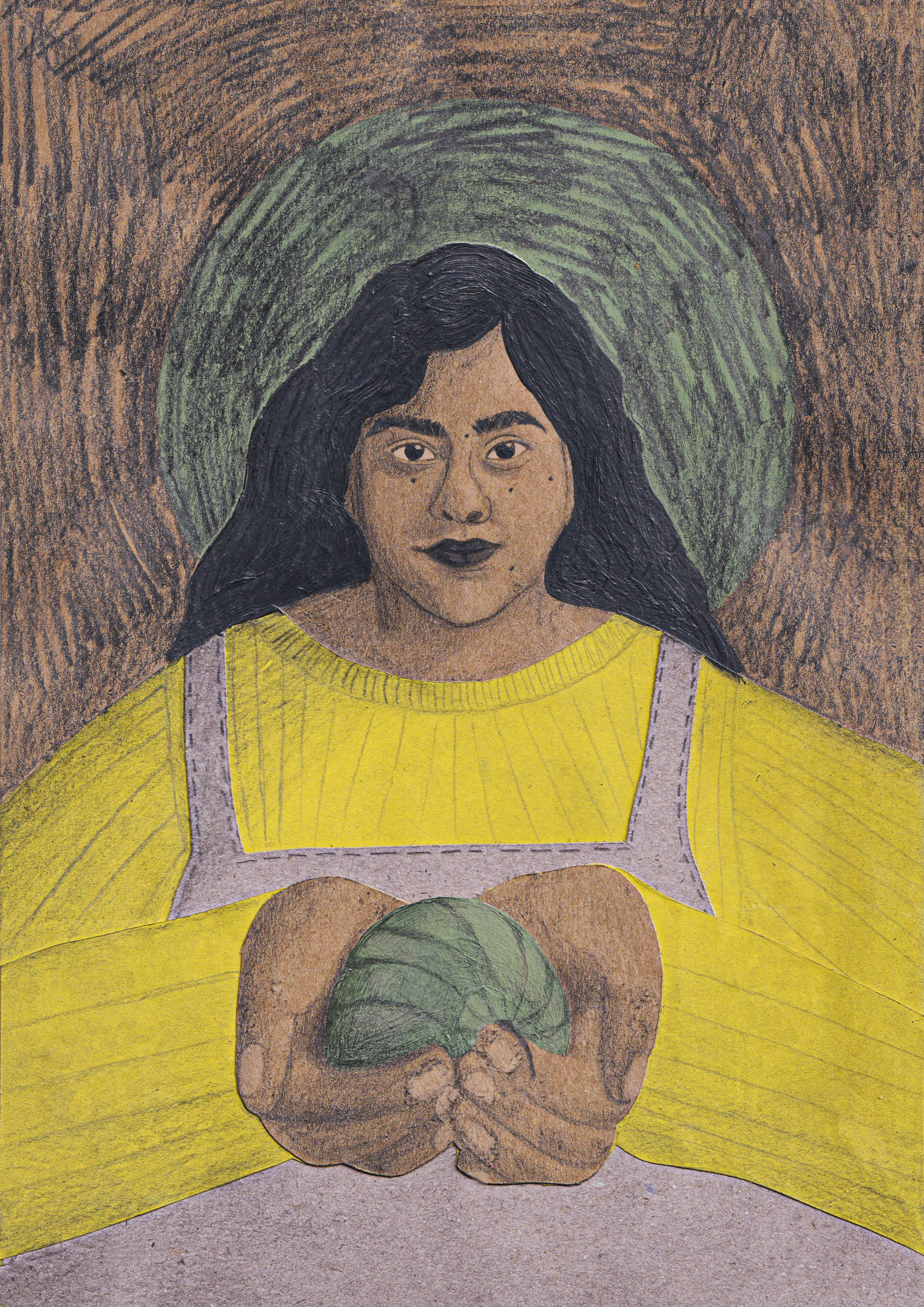 I played around with the hair color, but it felt weird to not have my hair black. Tomatillos and black hair are very essential to my identity. I also played around with the idea of the tomatillo. I liked drawing the cut tomatillo, but what I like most about it is the paper like casing that holds it, so I went with that.